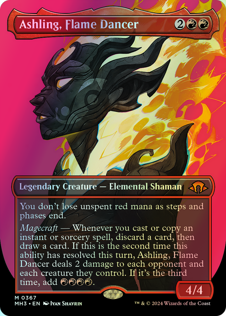 Magecraft — Whenever you cast or copy an instant or sorcery spell, discard a card, then draw a card. If this is the second time this ability has resolved this turn, Ashling deals 2 damage to each opponent and each creature they control. If it's the third time, add {R}{R}{R}{R}.