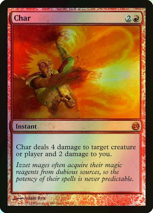 Char deals 4 damage to any target and 2 damage to you.