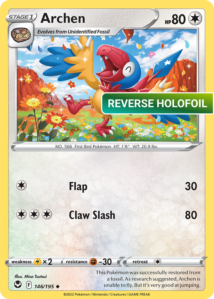 This Pokémon was successfully restored from a fossil. As research suggested, Archen is unable to fly. But it's very good at jumping.