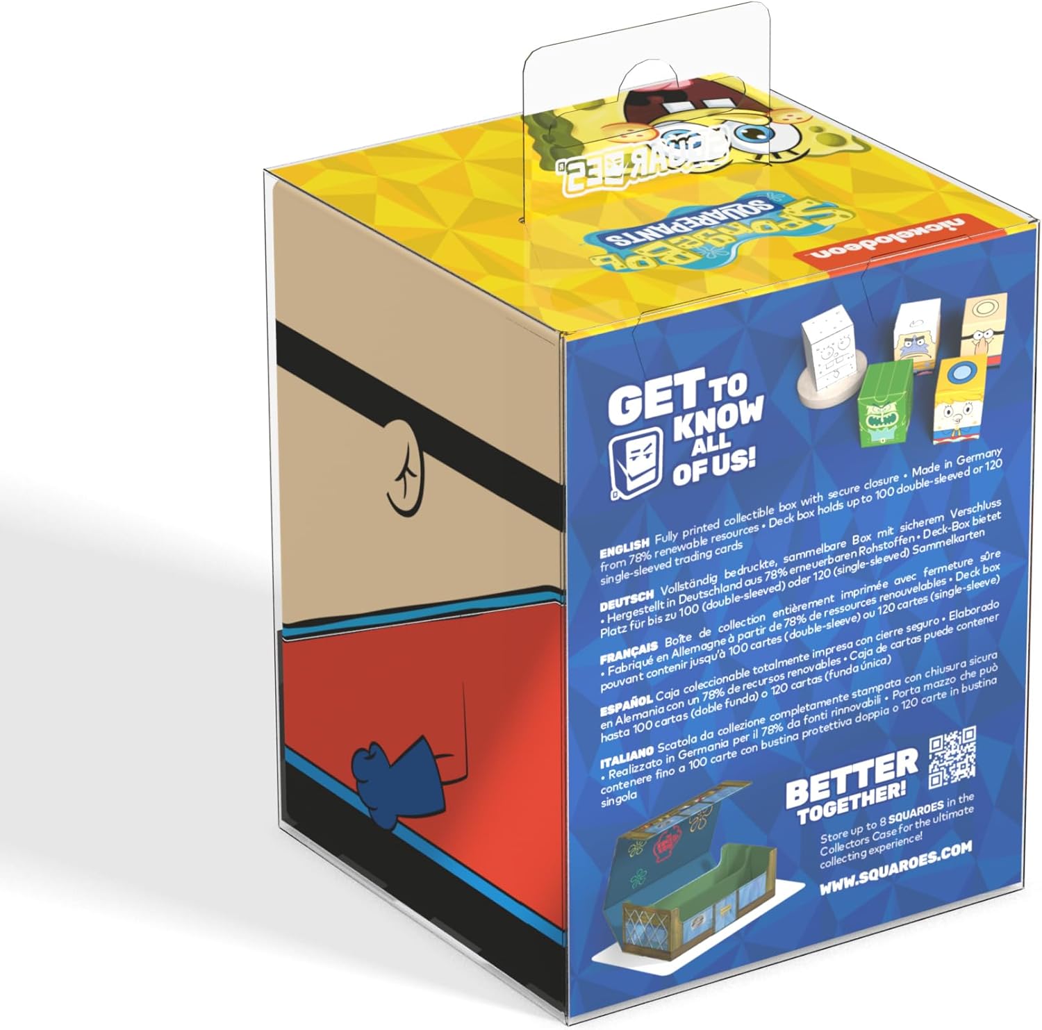 Collectible box for storing TCG decks, tabletop gaming accessories and/or collectibles. The Barnacle Boy Squaroe from the SpongeBob SquarePants™ edition holds up to 100 cards in double protective sleeves if used as a deck box. Squaroes are made from 78% renewable recources and fit perfectly into the separately available Collectors Case.